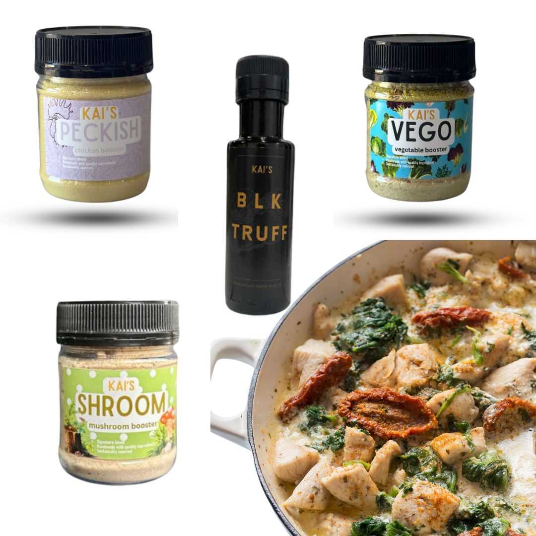 Shroom, Peckish and Vego to sprinkle into veggies, soups, pastas or noodles for your flavour boost - BLK TRUFF as a finishing drizzle on pastas, risottos or roast potatoes